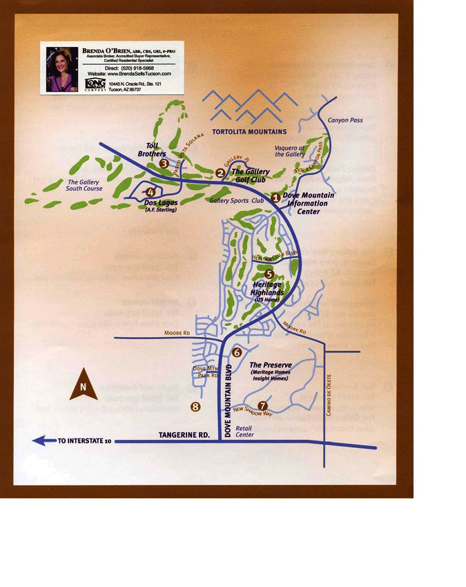 GATED SUBDIVISIONS: Canyon Pass At Dove Mountain Dos Lagos at Dove Mountain The Gallery at Dove Mountain Heritage Highlands Highlands At Dove Mountain Insight Homes at Dove Mountain Meritage at Los Saguaros Residences At The Ritz Carlton Tucson Solana at Dove Mountain The Cottages at the Gallery The Estates at Tortolita Preserve The Golf Villas at Solana The Preserve at Dove Mountain Toll Brothers at Dove Mountain Toll Brothers at Los Saguaros NON GATED SUBDIVISIONS: The Bluffs at Dove Mountain Quail Crossing Quail Crossing II The Retreat at Dove Mountain The Villages at Dove Mountain The Villages at Red Hawk |