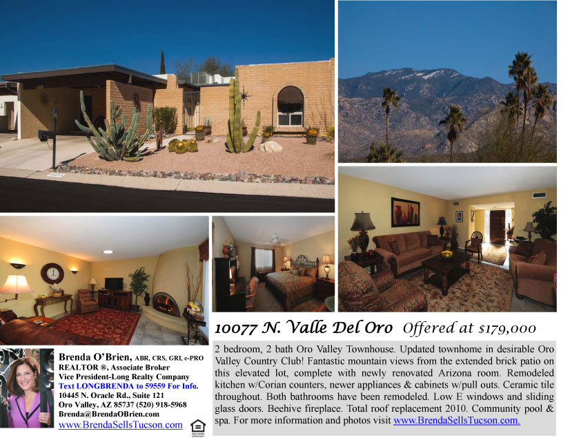 10077 N Valle Del Oro Dr is 2 Bedroom 2 Bathroom Oro Valley Townhouse in desirable Oro Valley Country Club.