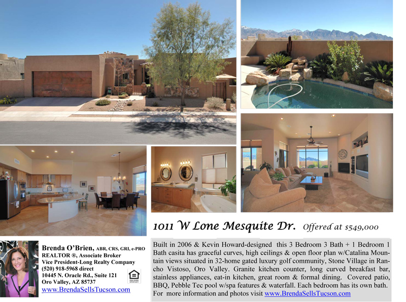1011 Lone Mesquite Dr is sited in Vistoso Golf Course Area in the Master Planned Community of Rancho Vistoso just Northwest of Tucson. It Sits in a small gated subdivision just up the street from the Vistoso Golf Course Club House.