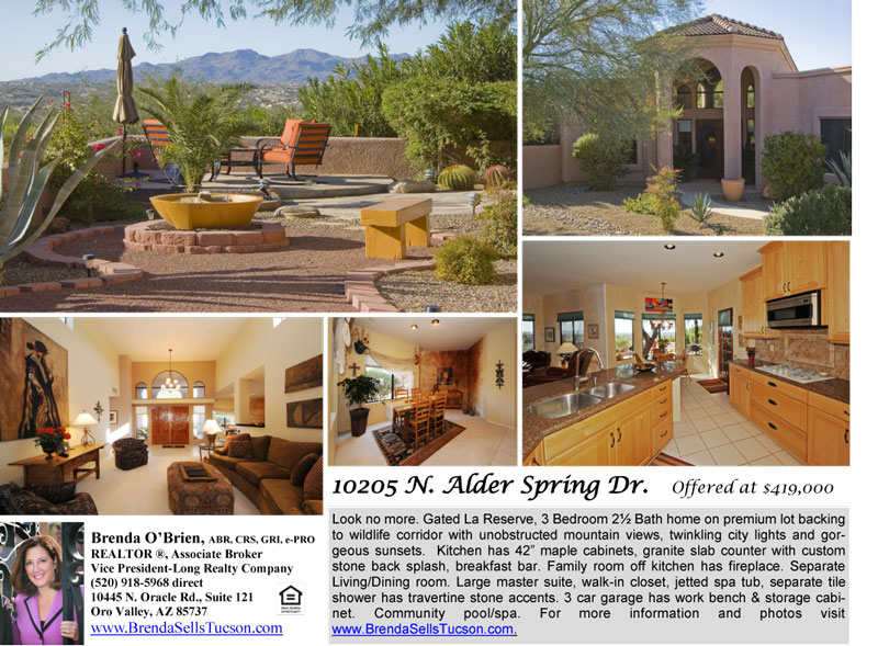 10205 N Alder Spring is sited on the side of Pusch Ridge overlooking Oro Valley in the luxury gated communitiy of La Reserve on the Northwest outskirts of Tucson.