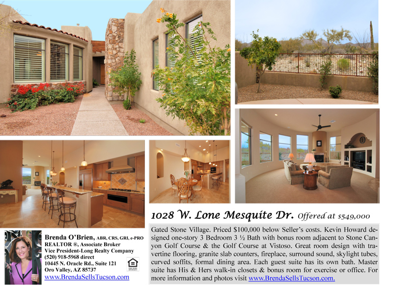 1028 W Lone Mesquite is sited at the top of Rancho Vistoso in Gated Stone Village on the Northwest outskirts of Tucson. Located adjacent to Stone Canyon Golf Course & the Golf Course at Vistoso, this is a delightful little pocket gated luxury subdivision in a wonderful neighborhood.