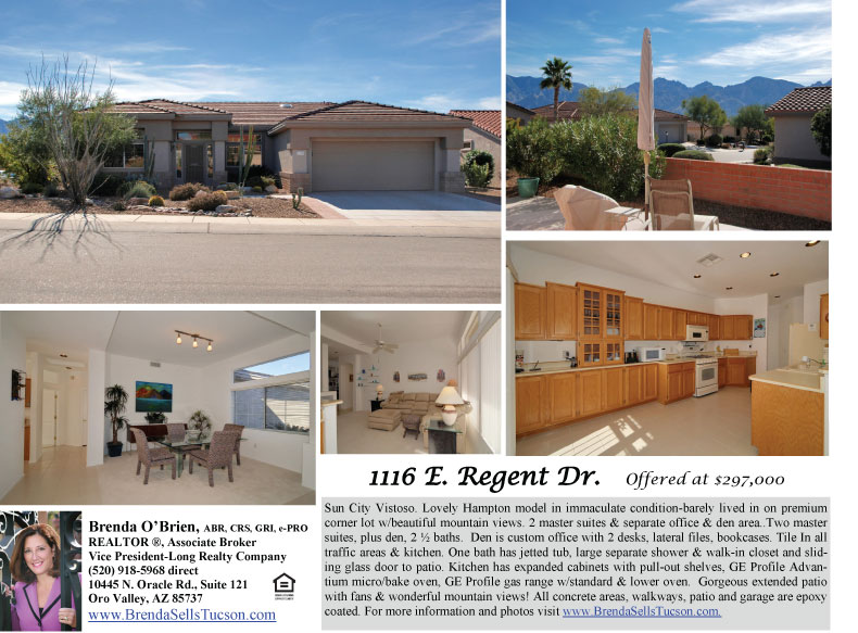1116 E Regent Dr is sited in a Premier Tucson Retirement Community named Sun City Vistoso just Northwest of Tucson. This Lovely Sun City Vistoso Home has been barely lived in and is in immaculate condition and sits on a premium corner lot with beautiful Catalina Mountain Views.