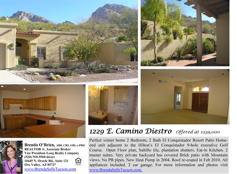 1229 E Camino Diestro is sited in El Conquistador Resort Homes and is the Perfect winter home in the El Conquistador Resort. This is a Patio Home end unit adjacent to the Hilton's El Conquistador 9-hole executive Golf Course.