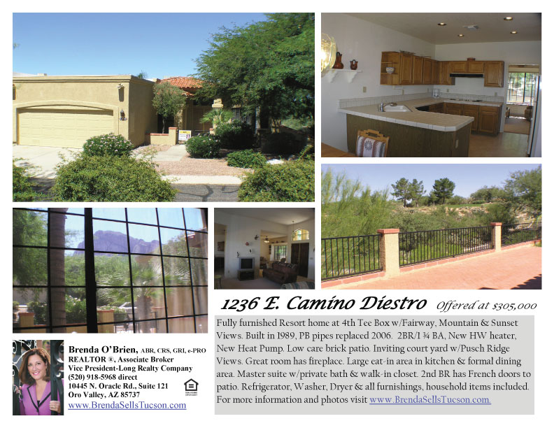 1236 Camino Diestro is a Cute little Golf Home in Oro Valley northwest of Tucson sitting on the El Conquistador Resort Golf Course surrounding the Hilton El Conquistador Resort.