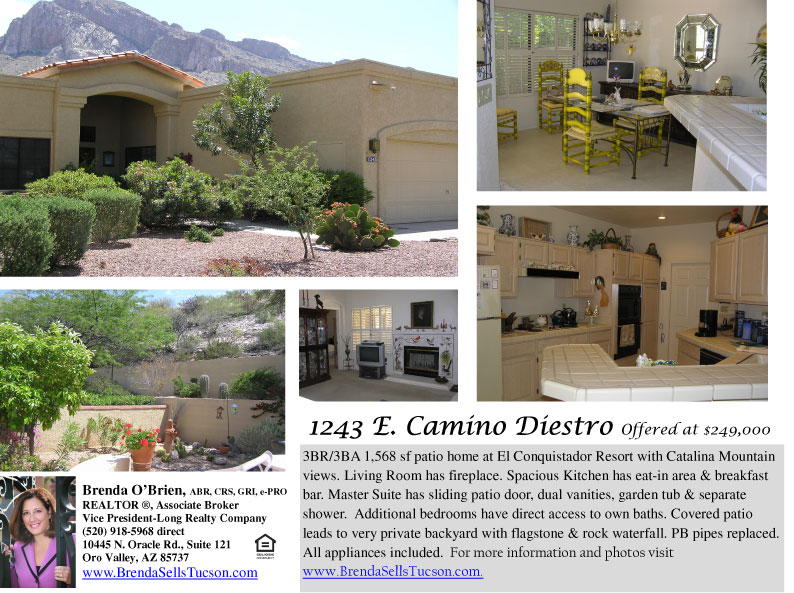 1243 Camino Diestro is sited at the El Conquistador Resort Patio Homes El Conquistador Resort with Catalina Mtn. views.