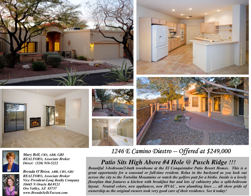 1246 E Camino Diestro is an El Conquistador Patio Home which sits high above the fourth green at the Pusch Ridge Golf Course! This lovely, original owner home is perfect for a winter get-away spot or year-round residence.