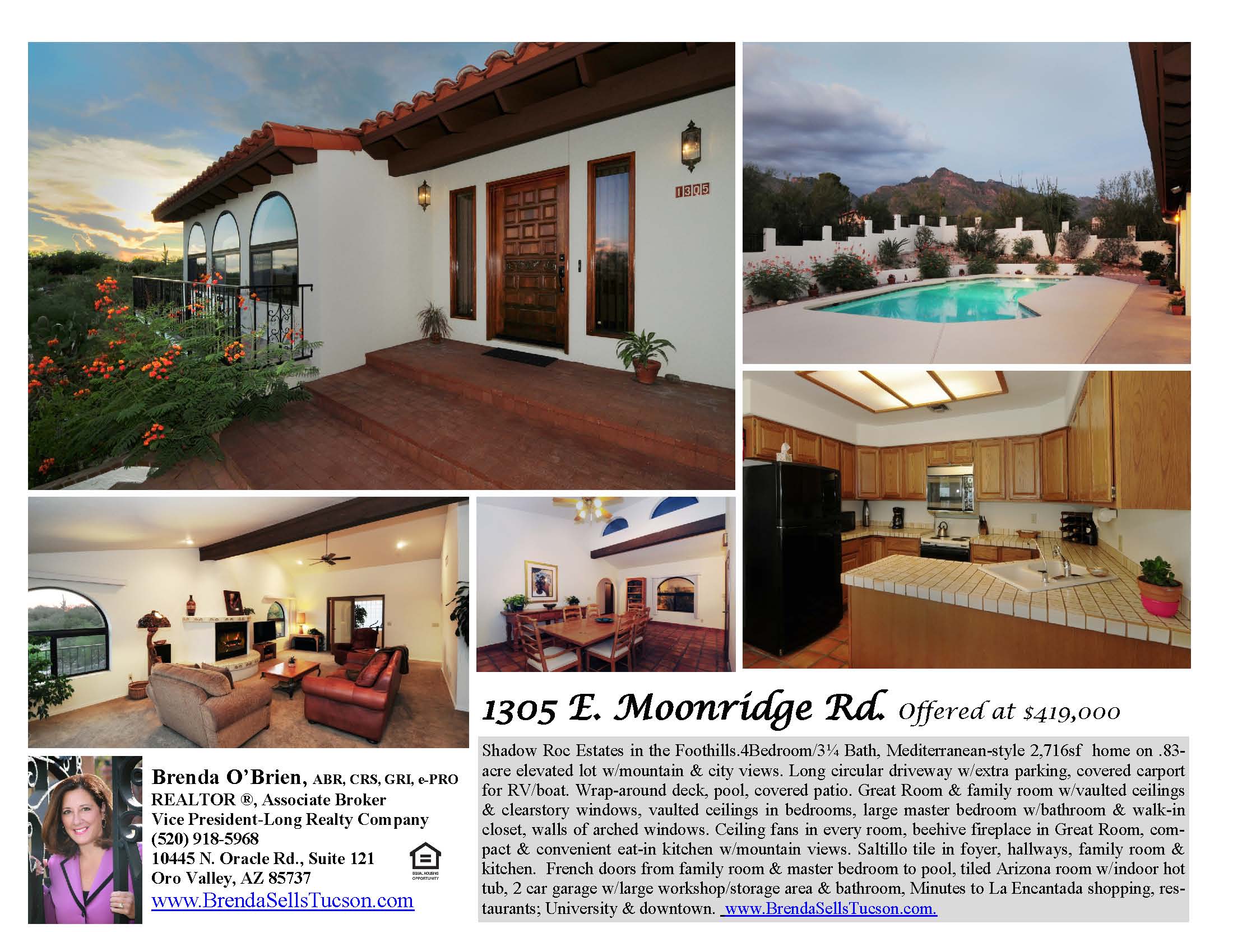 1305 E Moonridge Road is sited in the Shadow Roc Estates in the Catalina Foothills. This Mediterranean-style 2,716sf home sits on a .83-acre elevated lot with mountain & city views.
