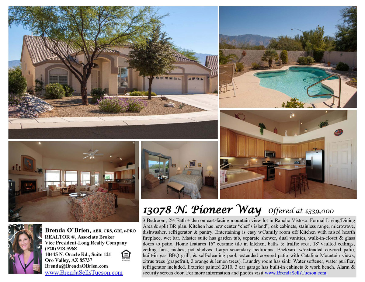 Driving Directions: From Tangerine & Rancho Vistoso Blvd; Go North on Rancho Vistoso, Go West on Samaniego Ridge Dr., Go South on Pioneer Way to address on left.