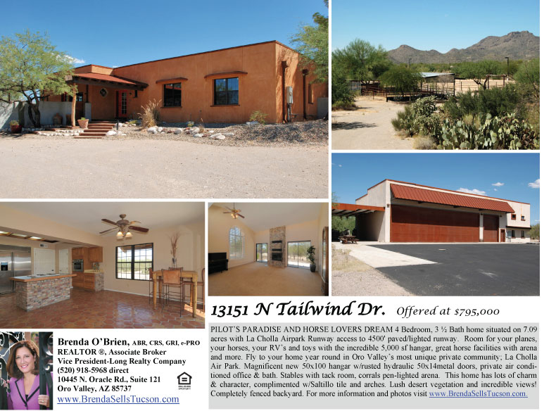 13151 N Tailwind Dr is a PILOT'S PARADISE AND HORSE LOVERS DREAM located in Oro Valley's La Cholla Airpark on the Northwest outskirts of Tucson.