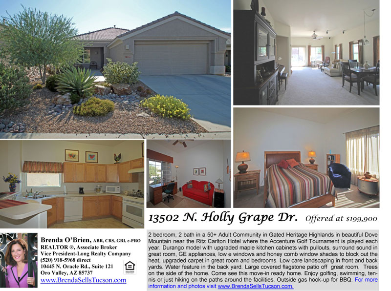 13502 N Holly Grape Dr is located in a beautiful age restricted community in Master Planned Dove Mountain on the Northwest outskirts of Tucson.