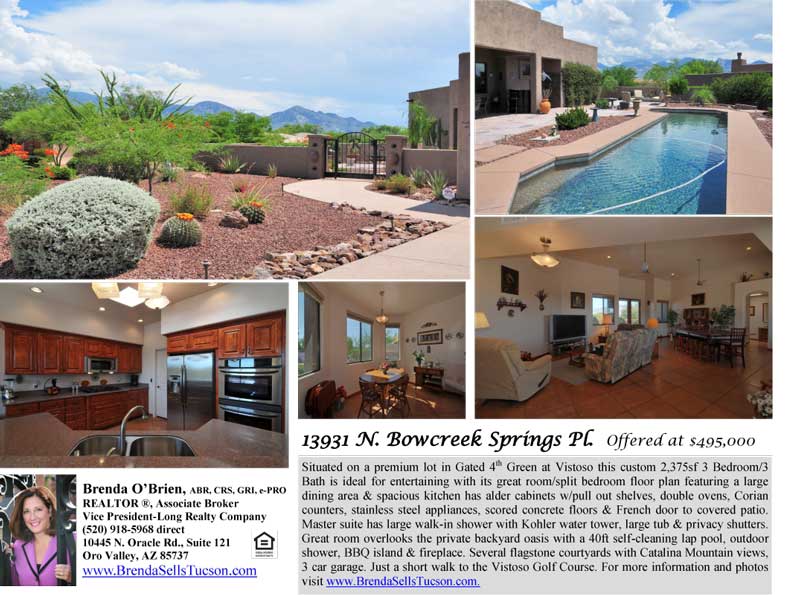 13931 Bowcreek Springs Pl is located in the Vistoso Golf Course Area in the Master Planned Community of Rancho Vistoso just Northwest of Tucson. It Sits in a small gated subdivision called the 4th Green at Vistoso right across from the Vistoso Golf Course Club House.