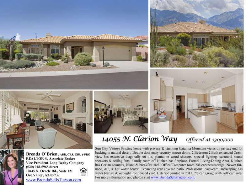 14055 N Clarion Way is located in the Master Planned Community of Rancho Vistoso just Northwest of Tucson. This Sun City Vistoso home sits on a private end lot backing to natural desert lot with stunning Catalina Mountain views.