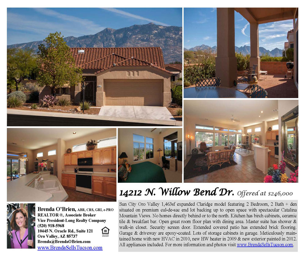 14212 N Willow Bend Dr is sited in Sun City Oro Valley in Northwest Tucson. This home sits on a premium cul-de-sac end lot backing up to open space with spectacular Catalina Mountain Views. No homes directly behind or to the north.