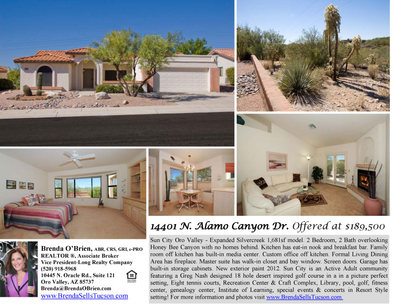 14401 N Alamo Canyon Dr is sited in Sun City Oro Valley in Northwest Tucson. This home sits on a nice lot overlooking Honey Bee Canyon with no homes behind.