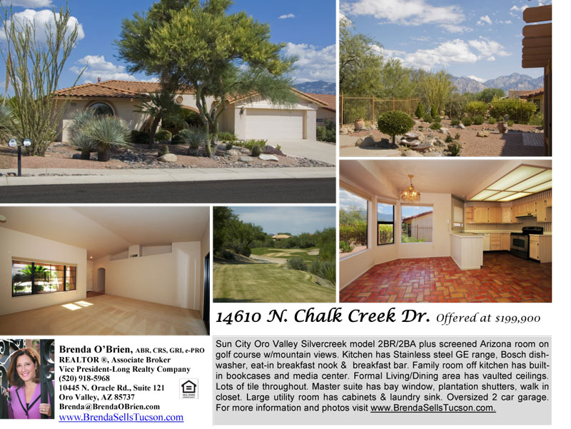 14610 N Chalk Creek Dr is sited in Sun City Oro Valley in Northwest Tucson. This home sits on a nice golf course lot with Catalina Mountain views.