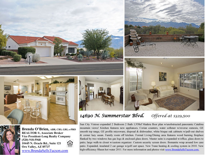 14690 N Summerstar is located in the Tucson Retirement Community of Sun City Vistoso located in the Master Planned Community of Rancho Vistoso just Northwest of Tucson. This home has unobstructed panoramic Catalina mountain views!
