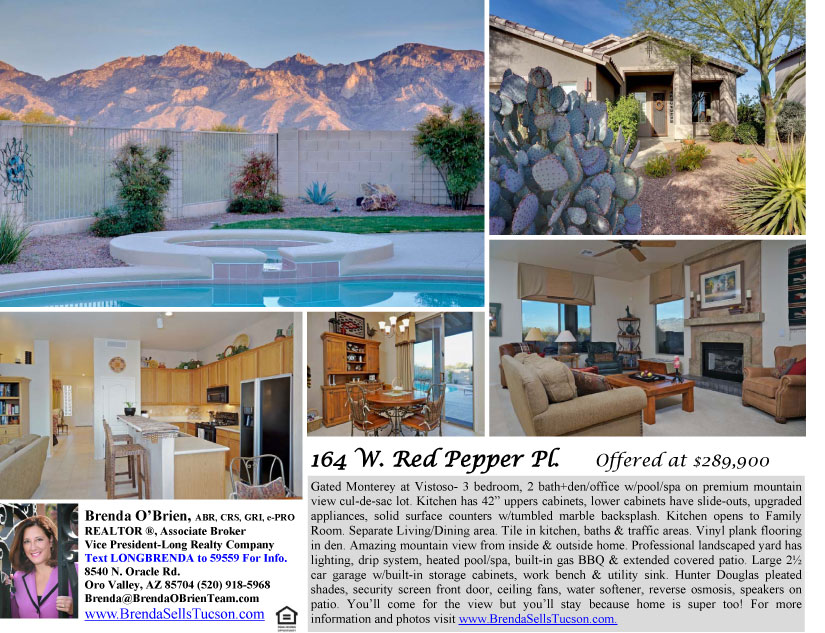 164 W Red Pepper Pl is sited in the Master Planned Community of Rancho Vistoso just Northwest of Tucson. This home sits on a premium mountain view cul-de-sac lot.