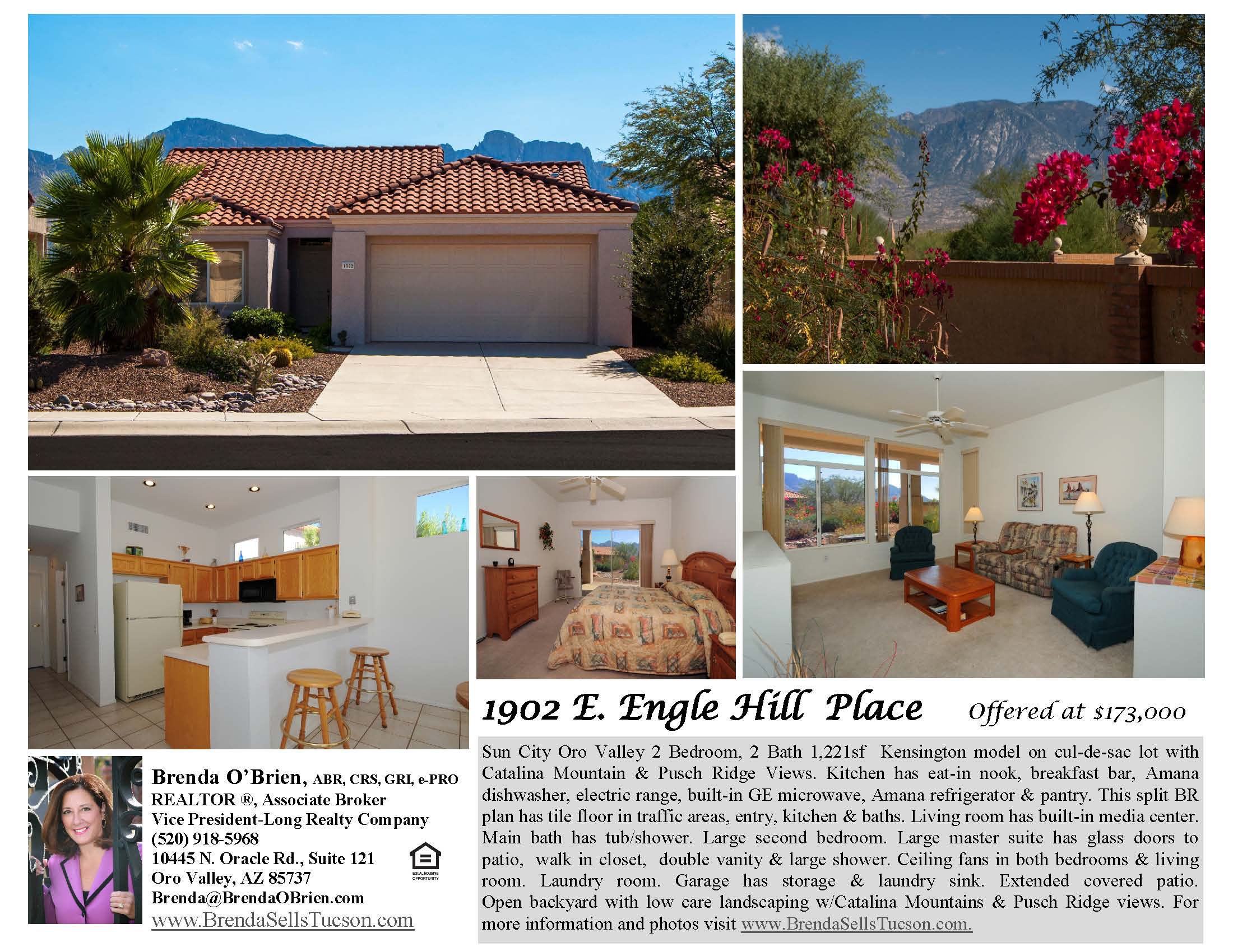 1902 E Engle Hill Pl is sited in Sun City Oro Valley in Northwest Tucson. This home sits on a cul-de-sac lot with Catalina Mountain & Pusch Ridge Views.