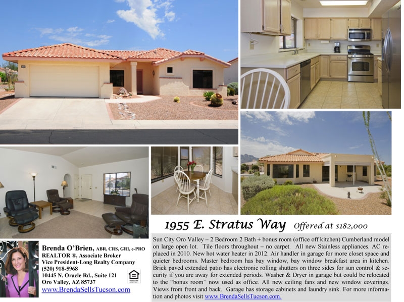 1955 E Stratus Way is sited in Sun City Oro Valley, an age restricted retirement community in Northwest Tucson. This home sits on a large open lot.