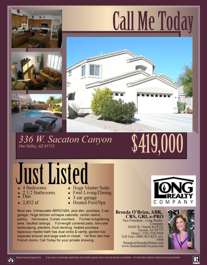 This Immaculate Oro Valley home features 4 Bedrooms, 2.5 Bathrooms and a Den in a Great open Floor Plan of 2832 square feet.