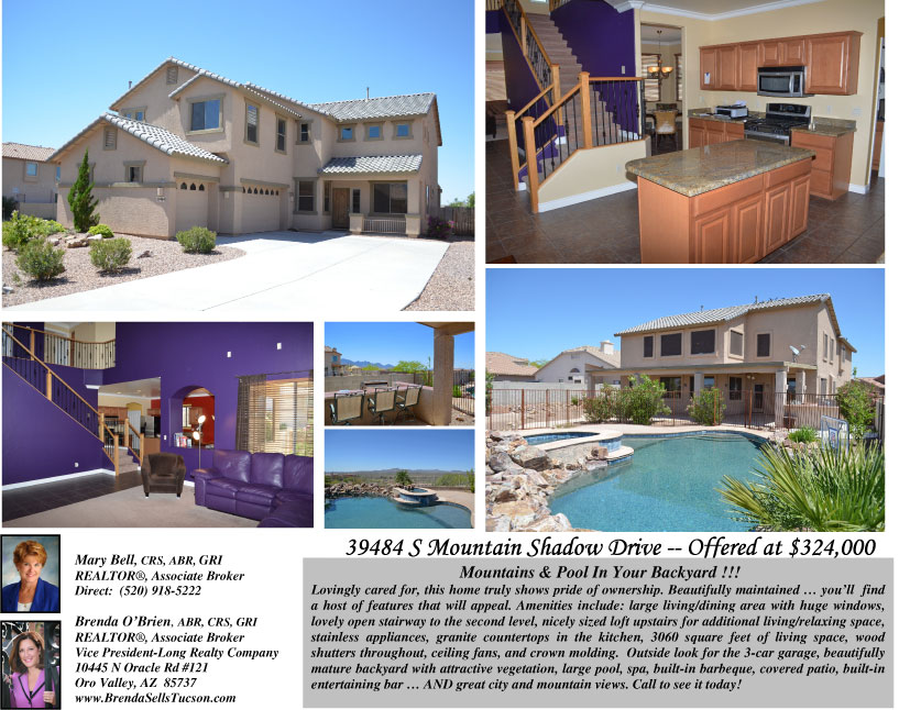 39484 S Mountain Shadow Dr is sited in Eagle Crest Ranch just Northwest of Tucson. This Eagle Crest home sits high atop a hill and offers spectacular views of the city and mountains.