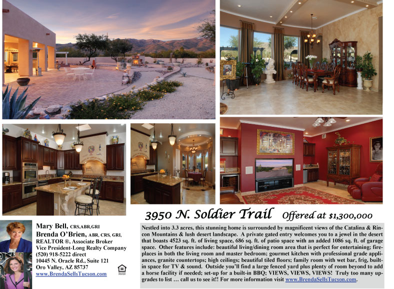 3950 N Soldier Trail is sited in Northeast Tucson on a premium 3.3 acre View Lot. There are magnificent views of the Catalina & Rincon Mountains and surrounding lush desert landscape.