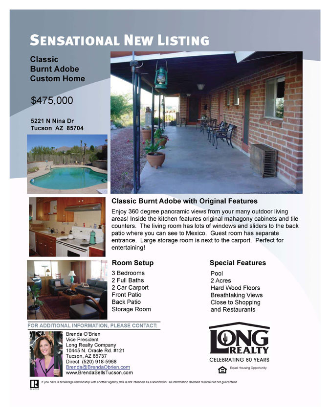 5221 N. Nina is a Classic Burnt Adobe home in Northwest Tucson with 360 degree panoramic views that include all five Tucson area mountain ranges.