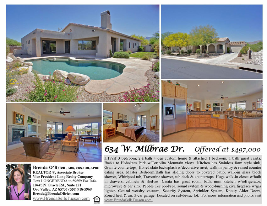 634 W Milbrae Dr is sited in the Master Planned Community of Rancho Vistoso just Northwest of Tucson. This home sits on a nice view lot backing to Hohokam Park with Tortolita Mountain views.