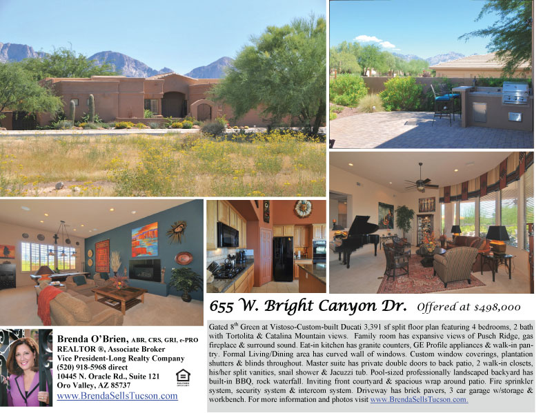 655 W Bright Canyon is sited in the Vistoso Golf Course Area in the Master Planned Community of Rancho Vistoso just Northwest of Tucson. It sits in a small gated subdivision right across from the Vistoso Golf Course Club House & has Catalina Mountain views.