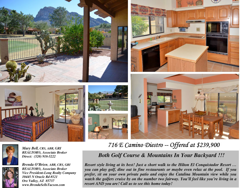 716 E Camino Diestro is a Charming El Conquistador townhome on the golf course. The east-facing patio overlooks the #2 hole at the Pusch Ridge course plus has wonderful Catalina Mountain views.