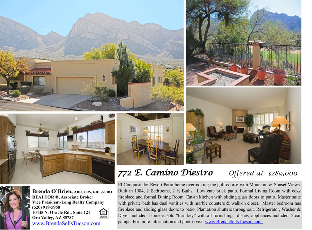 772 E Camino Diestro is a Charming El Conquistador townhome overlooking the golf course with Mountain & Sunset Views.