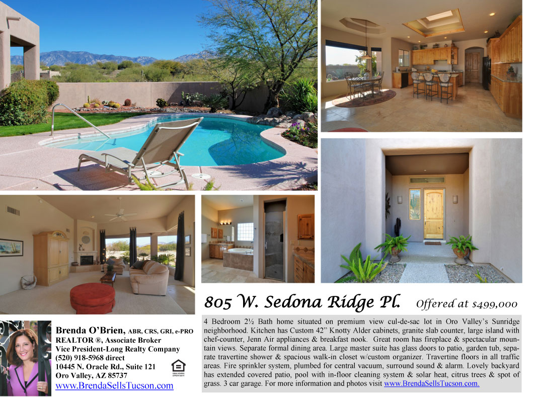 805 Sedona Ridge Pl is sited in Oro Valley just Northwest of Tucson. It Sits in a small semi-custom subdivision with easy access to everything Oro Valley has to offer. This home sits on almost half an acre on a premium view cul-de-sac lot with Catalina Mountain views.