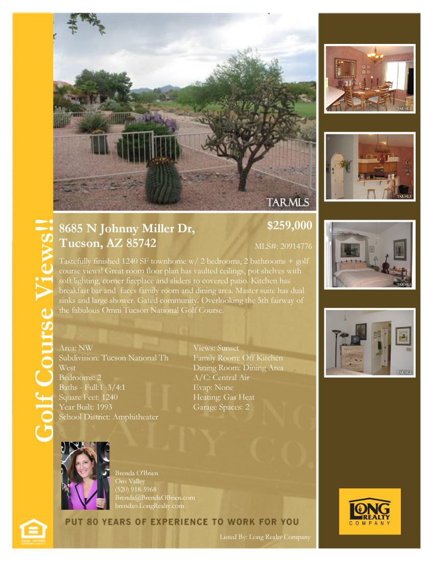 8685 Johnny Miller is sited in the wonderful Gated Golf Resort Community of Tucson National in Scenic Oro Valley just Northwest of Tucson. Golf Course Views? You Bet, nice ones!