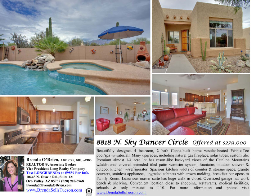 8818 N Sky Dancer Circle is sited in Northwest Tucson. This home sits on a Premium, almost 1/4 acre lot and has a resort-like backyard with views of the Catalina Mountains. This home has a very convenient location close to shopping, restaurants, medical facilities, schools & only minutes to I-10.