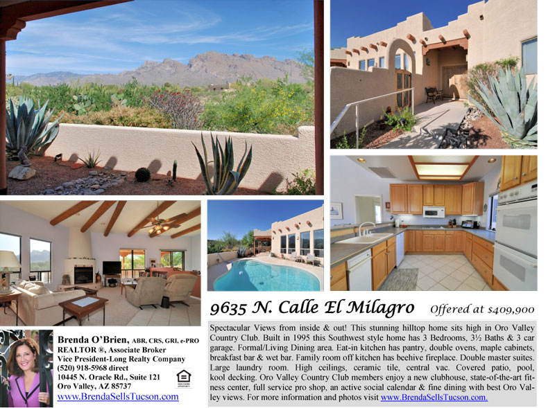 9635 N Calle El Milagro is a hilltop home sitting high above Oro Valley Country Club in the middle of Oro Valley just Northwest of Tucson. This Oro Valley Estates home has Spectacular Views from inside & outside of the Catalinas.