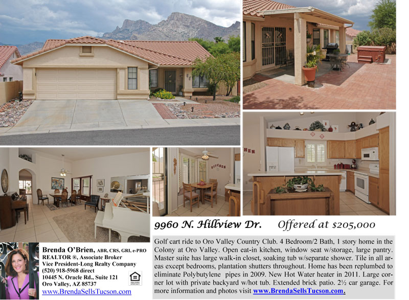 9960 N Hillview Dr is just a Golf cart ride to the Oro Valley Country Club. This Hillview home sits on a Large corner lot with private backyard.