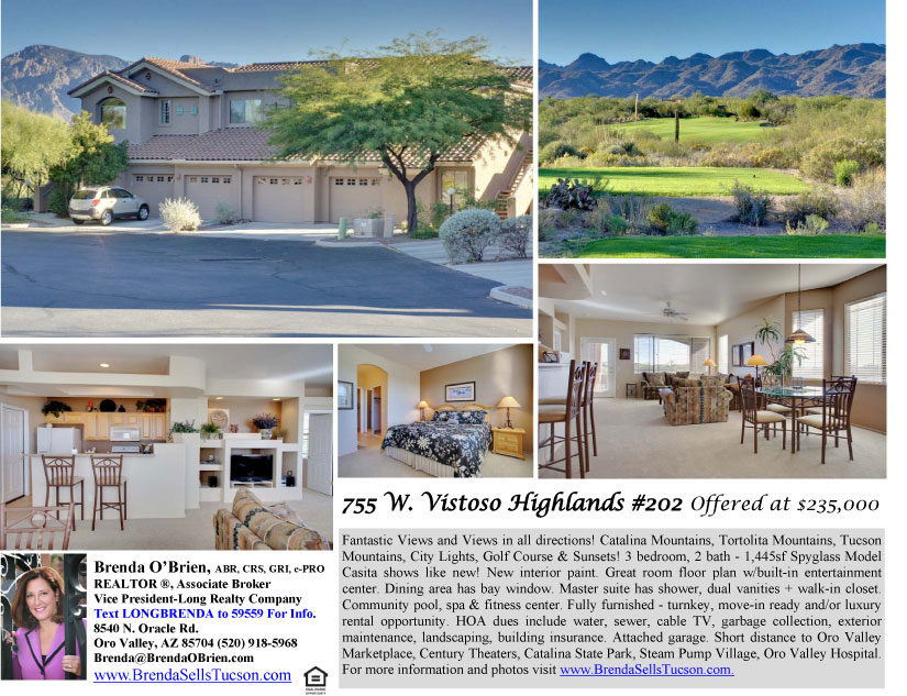 Driving Directions: From Tangerine & Rancho Vistoso; Go North on Rancho Vistoso; Go West on Vistoso Highlands; Turn Left at 755 to Bldg 1, Unit 202.